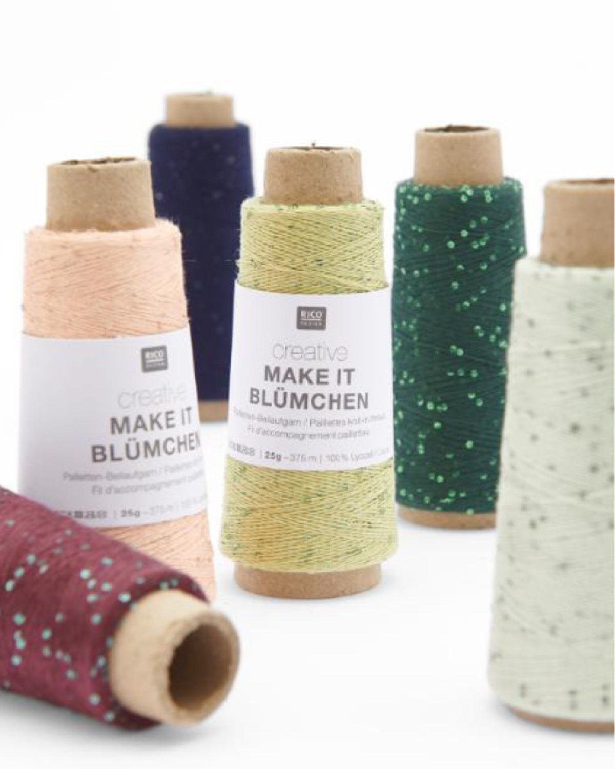 Make It Blümchen fra Rico Design er et flot effektgarn med små pailletter formet som blomster. Det er perfekt som følgetråd i strikke- eller hækleprojekter, hvor det giver et elegant og smukt udseende. Garnet ændrer ikke strukturen af dit projekt eller din strikkefasthed.